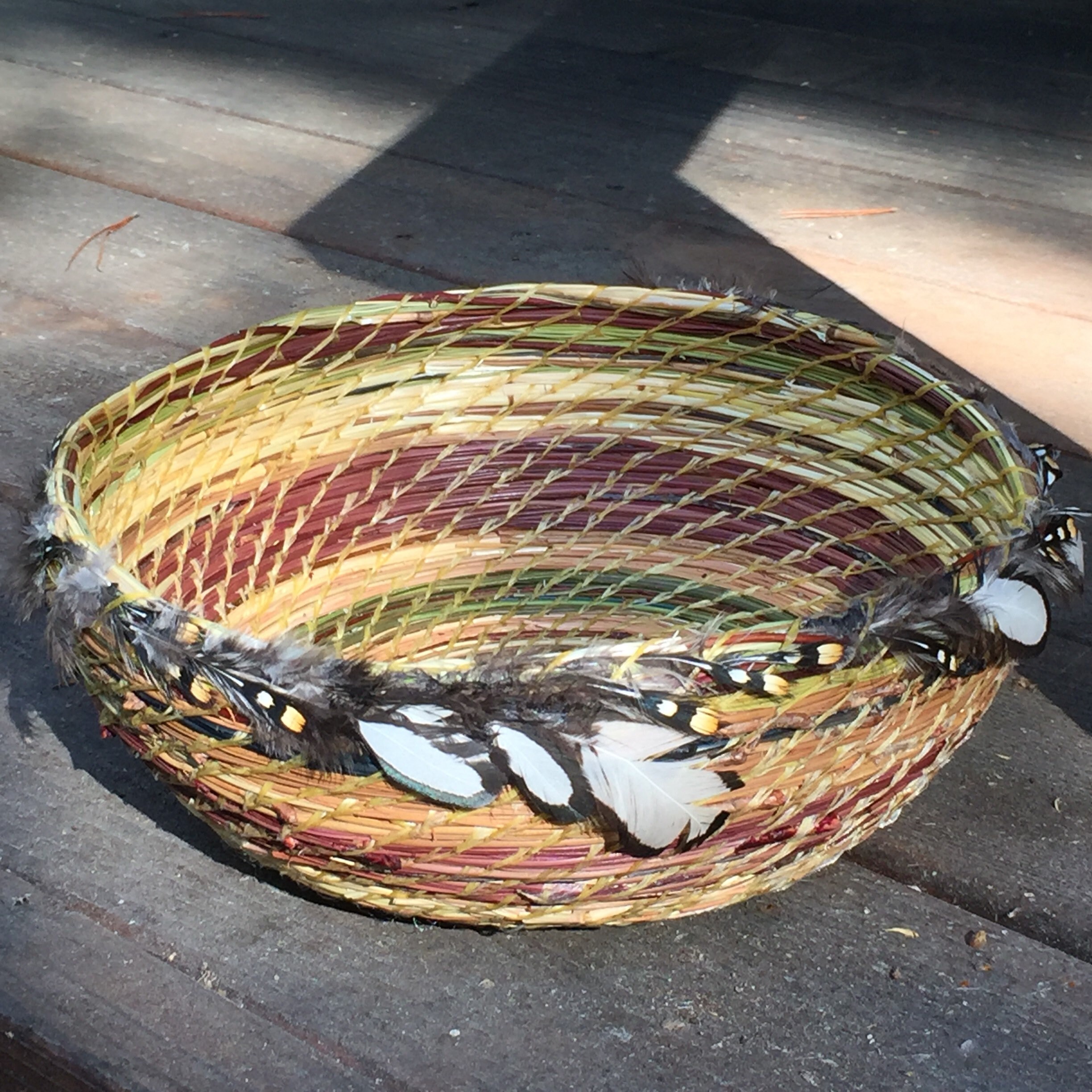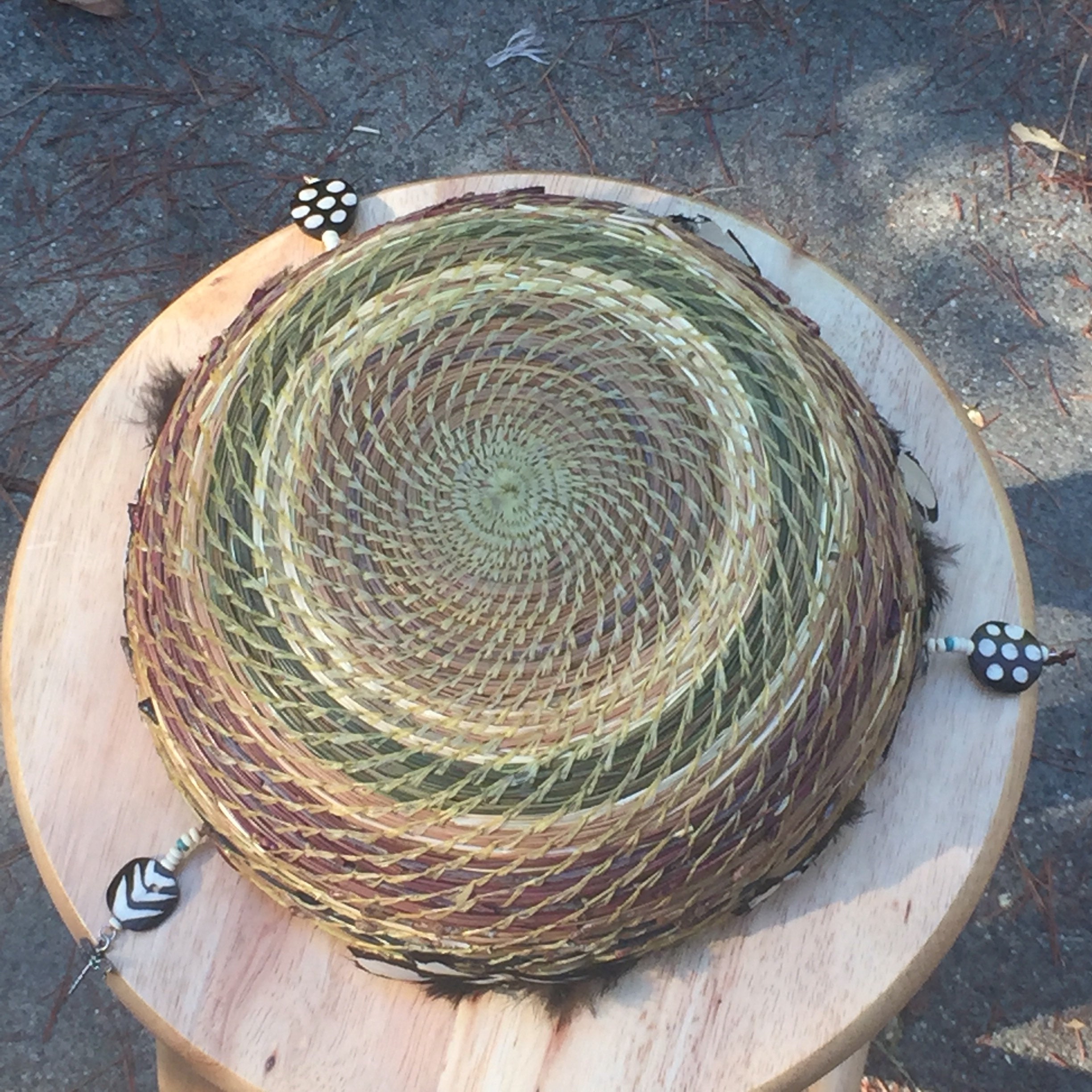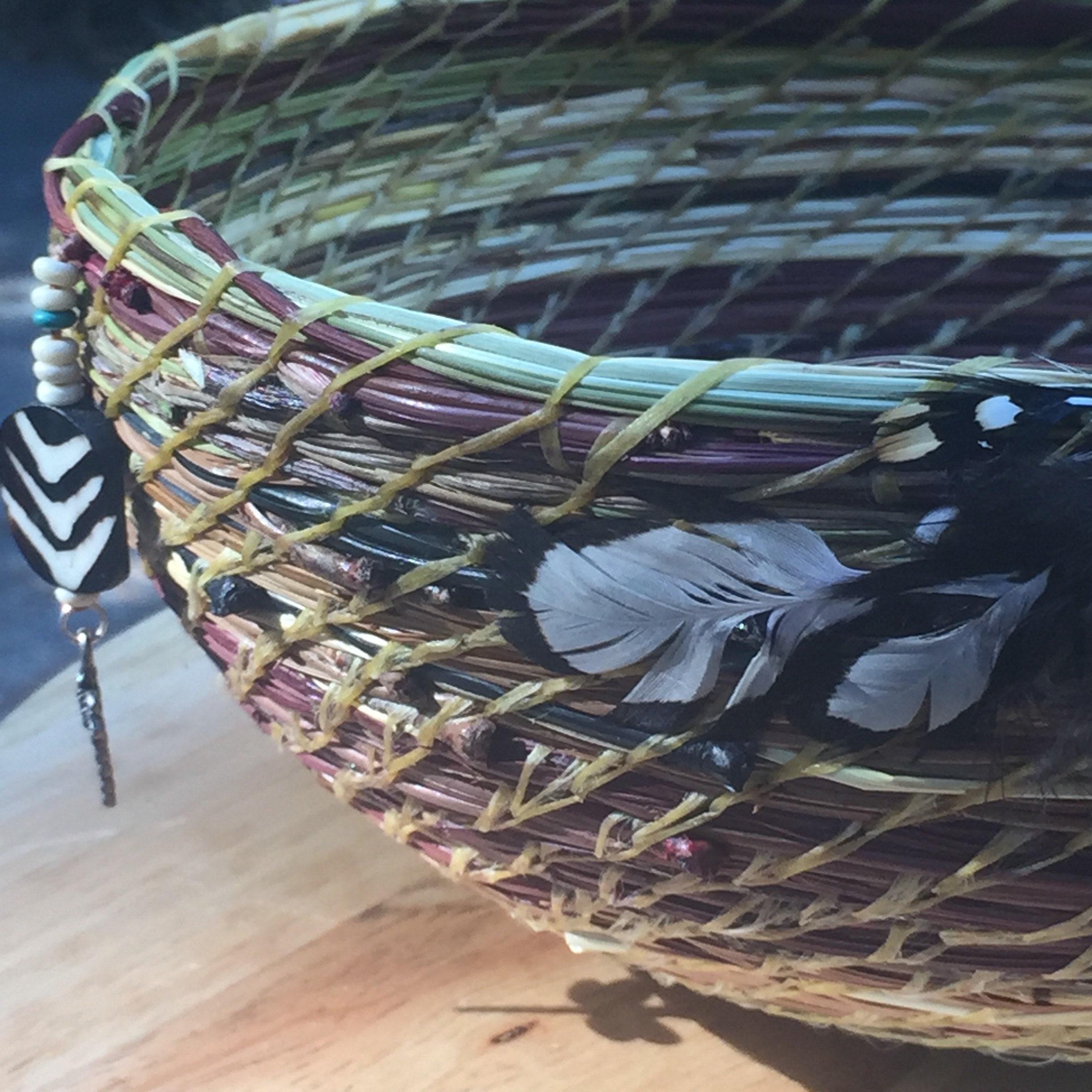 On this basket I retained the end cap on some of the pine needles for texture. When I dye the needles, this part holds more of the dye, a deeper, richer color. I added hen feathers, dragonfly charms, and beads to complete it.