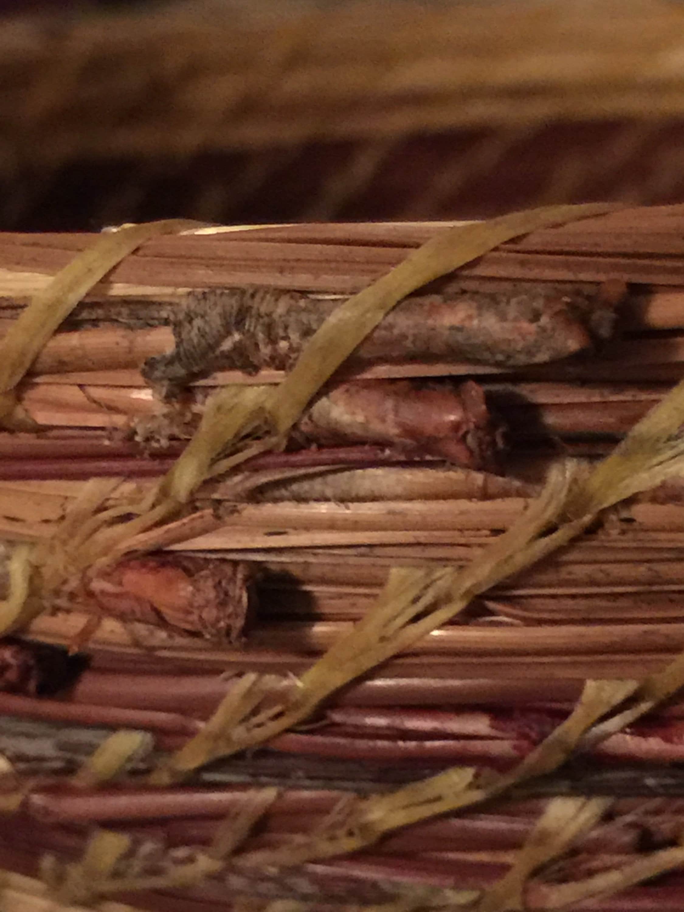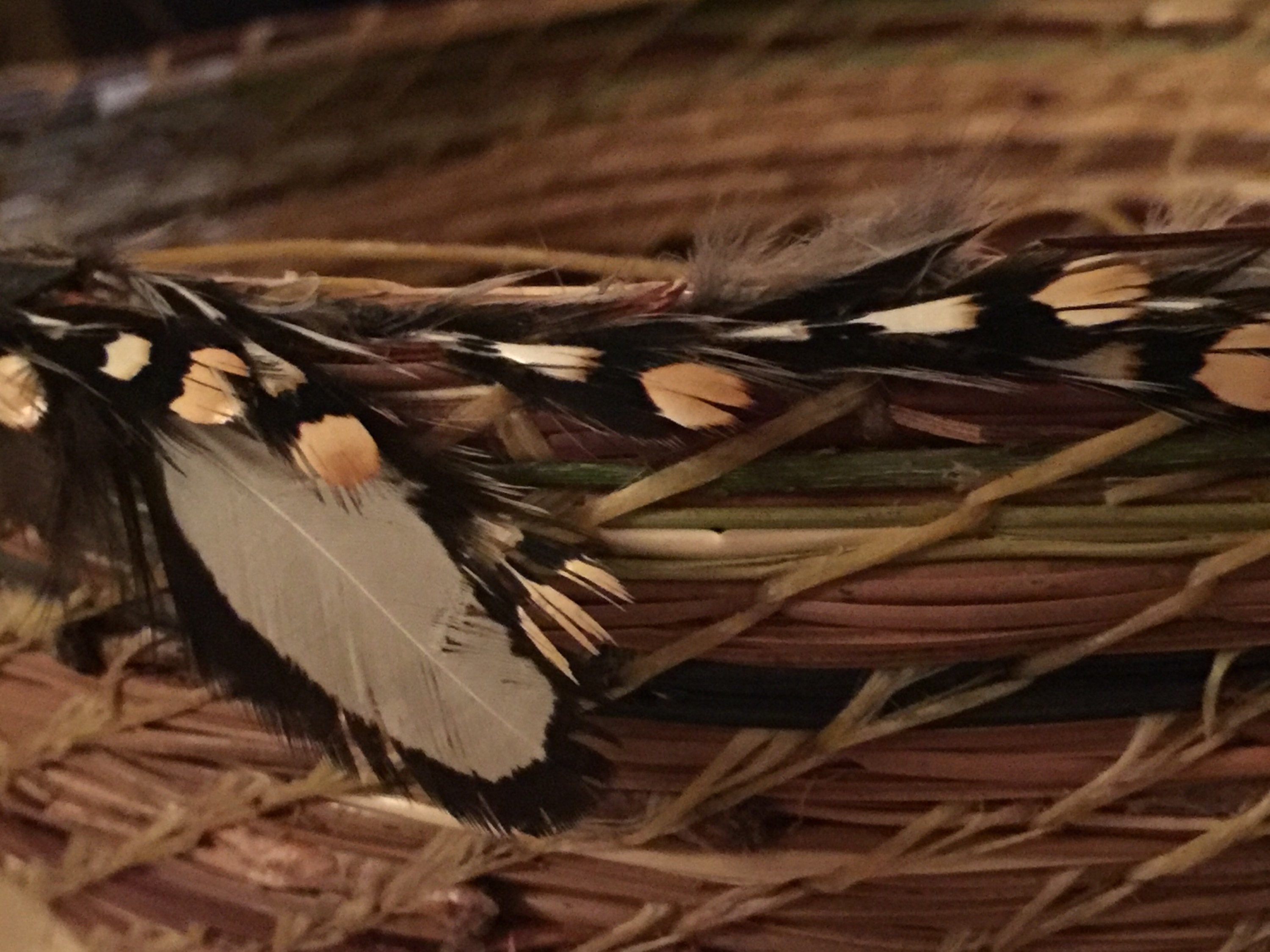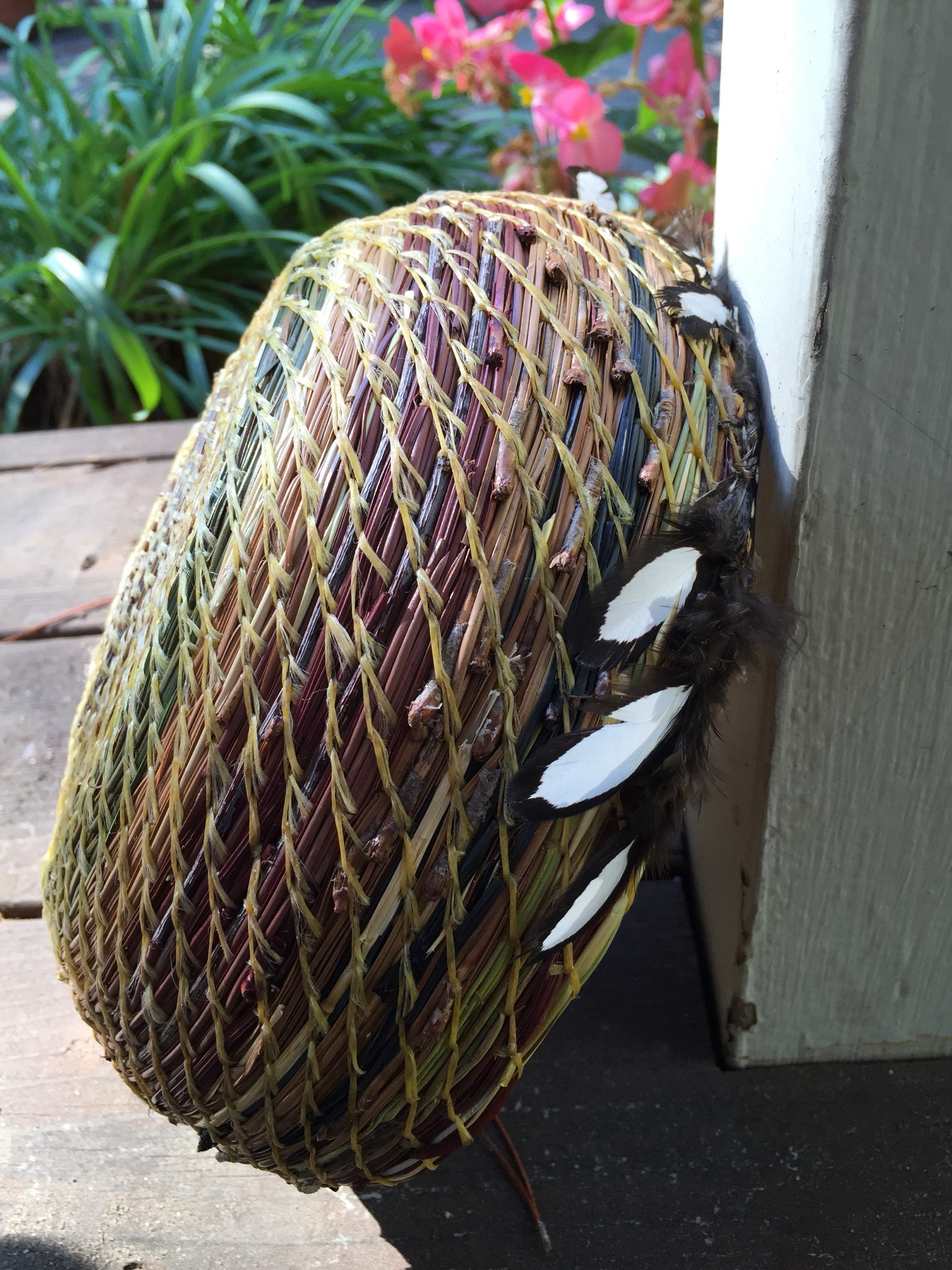 On this basket I retained the end cap on some of the pine needles for texture. When I dye the needles, this part holds more of the dye, a deeper, richer color. I added hen feathers, dragonfly charms, and beads to complete it.