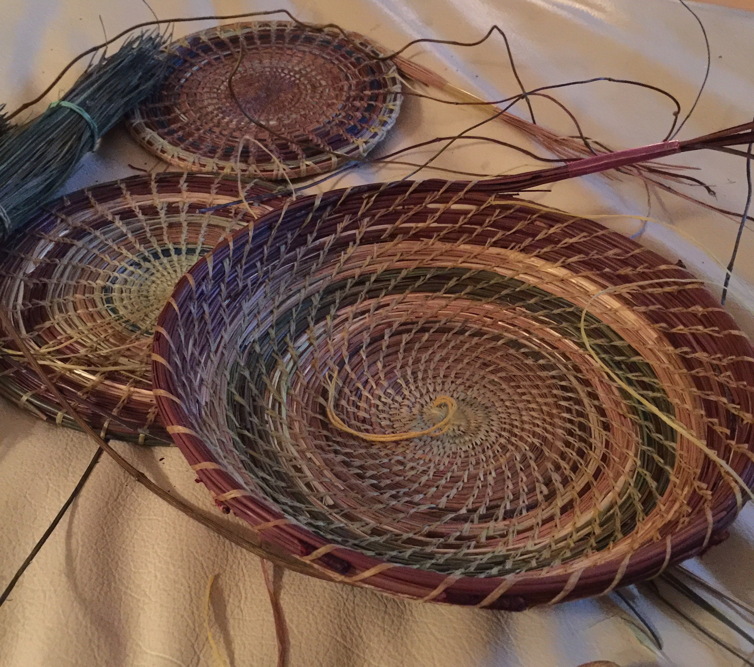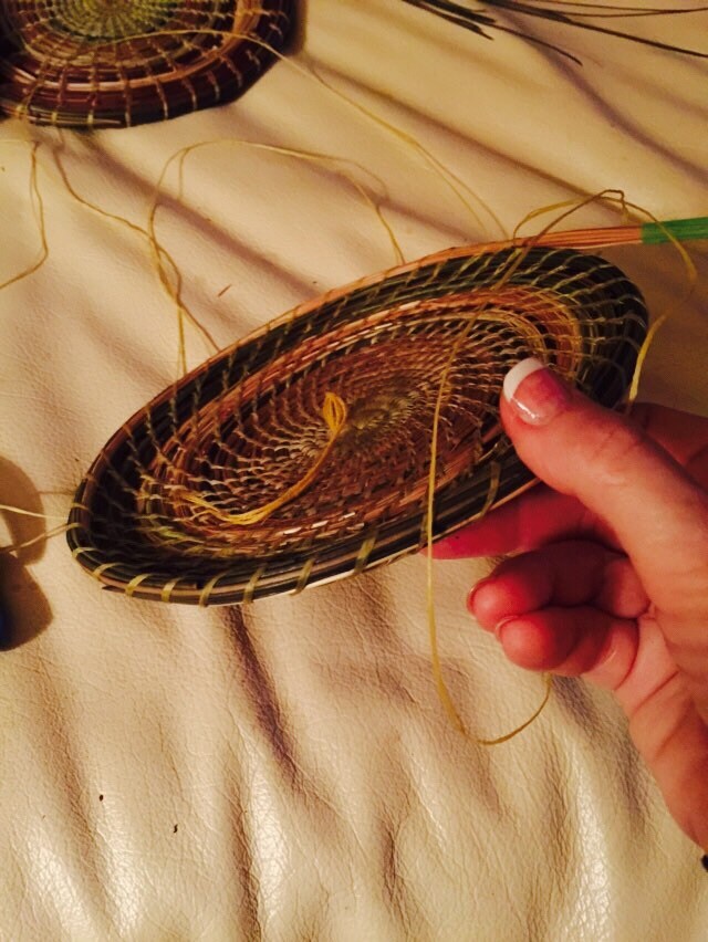This bowl was inspired by the beautiful meadow outside my studio in Napa, California. I collected pine needles from the ground on our property, along with wild oats up on our hill. I used vines from the Carolina Jessamine that grows on the arch I pass through to the meadow, where every spring it blossoms into a chaos of yellow. I used rushes grown 10 steps from my open door.